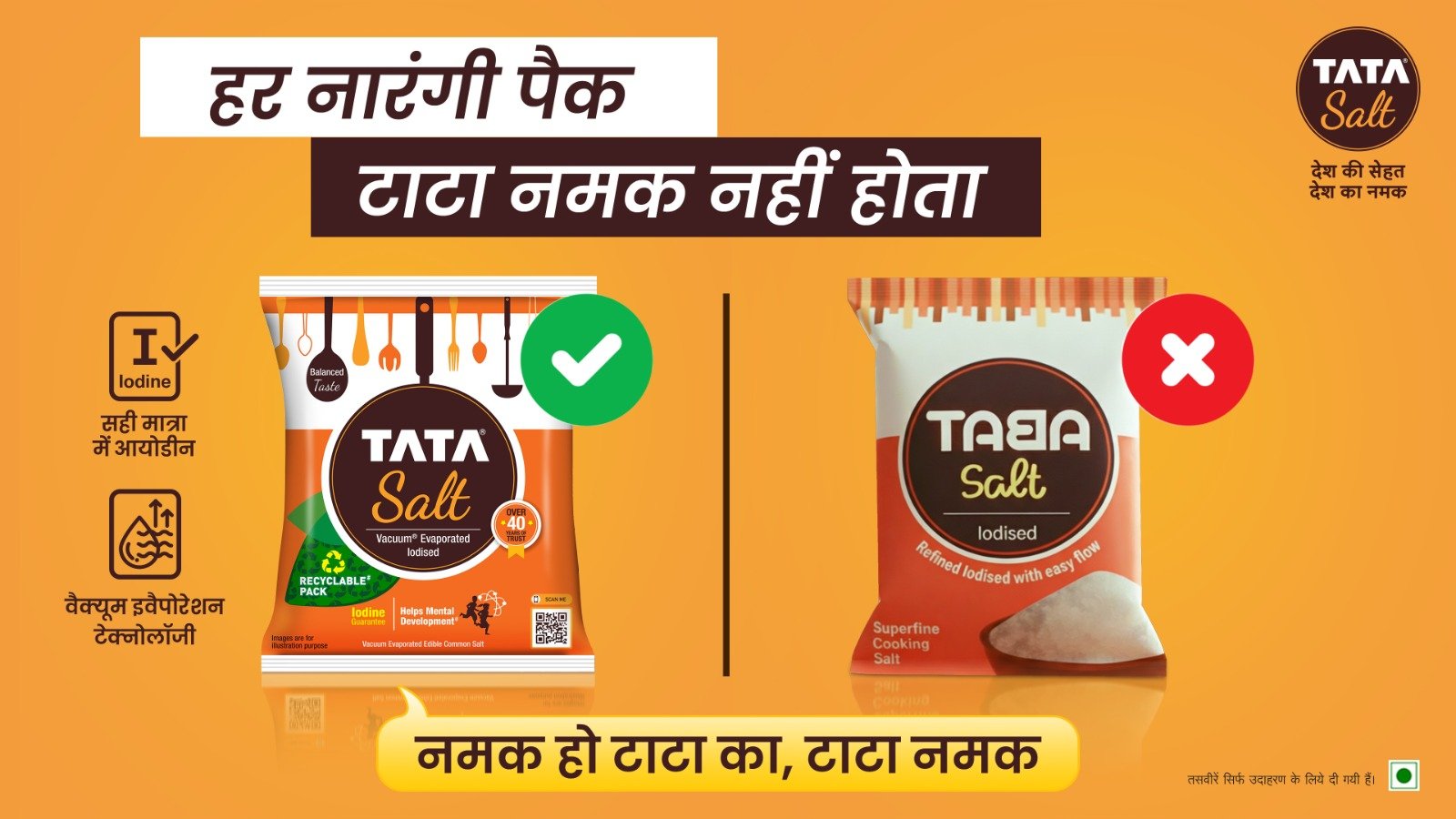 ‘हर नारंगी पॅक टाटा नमक नही होता’ या घोषणेचा उद्देश प्रत्येक केशरी रंगाचा पॅक टाटा सॉल्टचाच नसतो, याबाबत जनजागृती करण्याचा आहे. या मोहिमेद्वारे दिसायला सारख्या पण बनावट मीठ पॅकबाबत ग्राहकांचे प्रबोधन केले जाणार आहे. भेसळमुक्त, उच्च दर्जाच्या मिठाची हमी देणारा योग्य केशरी रंगाचा पॅक निवडण्याचा हा संदेश आहे. महाराष्ट्रामधील असंघटित मीठ बाजारपेठेतील आव्हानांनंतरही टाटा सॉल्ट ब्रँड हा कुटुंबांच्या आरोग्य व कल्याणासाठी विश्वासार्ह पर्याय आहे. आयोडाइज्ड, भेसळमुक्त मिठाच्या प्रत्येक पॅकद्वारे भारताच्या पोषणविषयक उद्दिष्टांमध्ये योगदान देत, त्याचे पोषणमूल्य अधोरेखित केले जाते.