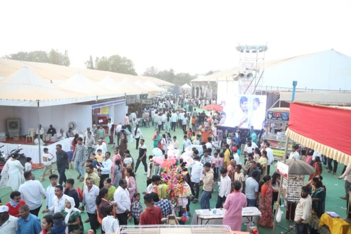 कोल्हापूर/प्रतिनिधी : मेरी वेदर मैदानावर भरविण्यात आलेल्या भीमा कृषी प्रदर्शनाच्या आजच्या तिसऱ्या दिवशी कृषी प्रदर्शन पाहण्यासाठी लहान मुलांसह आबालवृद्धांनी आणि शेतकऱ्यांनी तोबा गर्दी केली होती.पाच फूट सरडा आणि एकाच मैदानावर तेरा वेळा रेकॉर्ड केलेला हिंदकेसरी हरण्या बैल,अन्य जनावरे पाहण्यासाठी लोकांची अफलातून गर्दी,महापूर मेरी वेदर मैदानावर लोटला होता.याचबरोबर शतकवीर हिंदकेसरी शर्यतीमधील हरण्याबैल, तीन वर्षाची राधा गाय,मारवाडी जातीचा स्टेलियन गब्बर नावाचा काळा रंगाचा घोडा,३५० किलोचे डुक्कर १२० आणि ९० किलो वजनाचे बोकड,३३ इंचाचा घोडा,एक टनाचा लाल कंधारी बैल,मुरा रेडे,१० डझनाचा केळी घड,११ किलोचा भोपळा,१० किलोचा कोहळा प्रदर्शनाचे ठरत आहेत आकर्षण.
