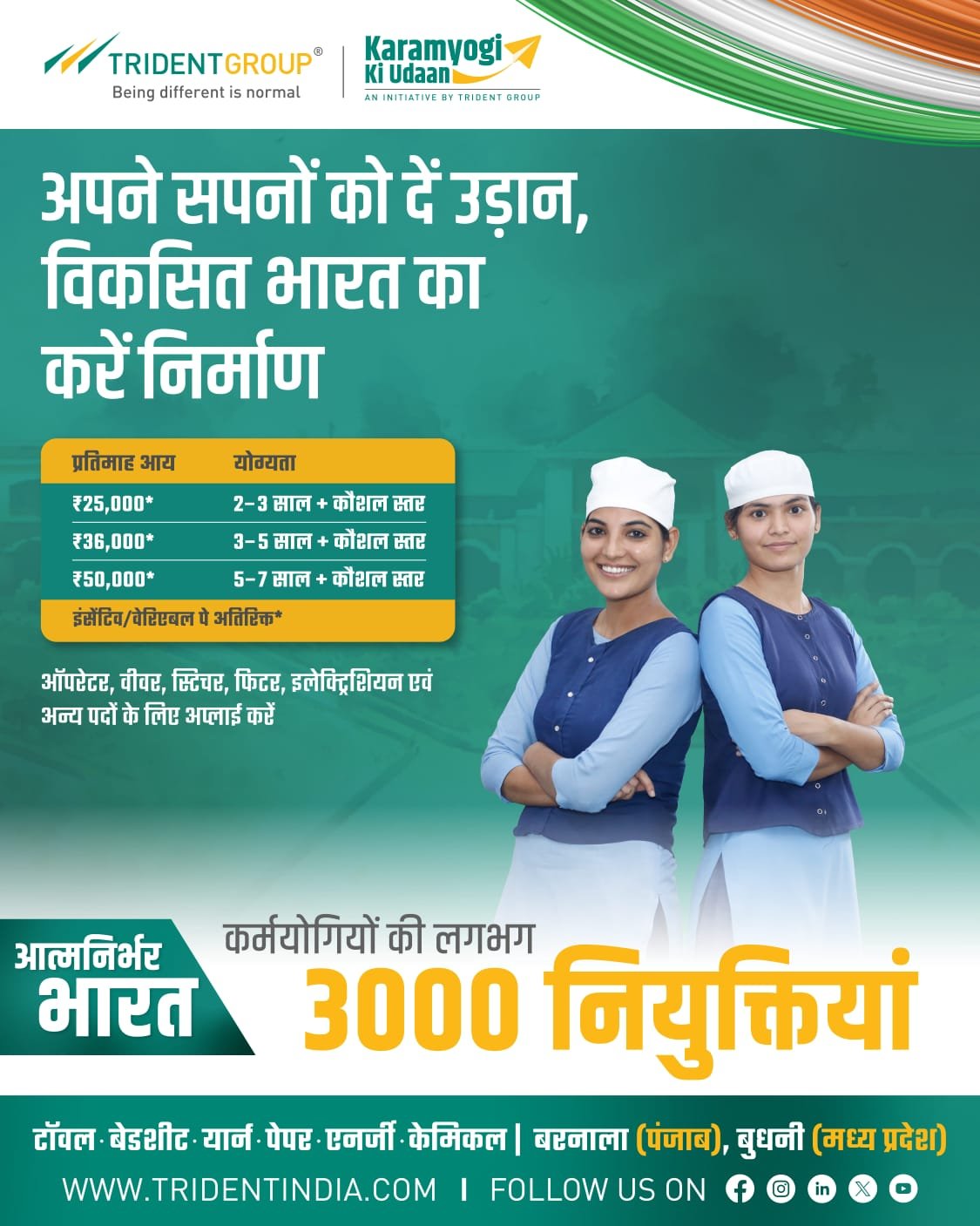 या घोषणेबद्दल ट्रायडंट ग्रूपच्या ग्रूप सीएचआरओ पूजा बी. लुथ्रा म्हणाल्या, “ट्रायडंटमध्ये आमचा ठाम विश्वास आहे की भारताच्या उत्पादन क्षेत्रातील बदलांचा पाया प्रतिभावान मनुष्यबळात आहे. या मोठ्या प्रमाणावरील भरती प्रक्रिया मोहिमेद्वारे आम्ही आमच्या मनुष्यबळाला बळकटी देत आहोत आणि त्याचवेळी लवचिक आणि भविष्यासाठी सज्ज उत्पादन परिसंस्था निर्माण करण्याच्या राष्ट्रीय उद्दिष्टाला हातभार लावत आहोत. व्यवसायवृद्धीपलिकडे दीर्घकालीन करिअर जोपासणे, समुदायांना बळकटी देणे आणि जागतिक उत्पादन नेतृत्व बनण्याच्या भारताच्या प्रवासात अर्थपूर्ण साह्य देण्यासाठी आम्ही सातत्याने प्रयत्न करत आहोत.”